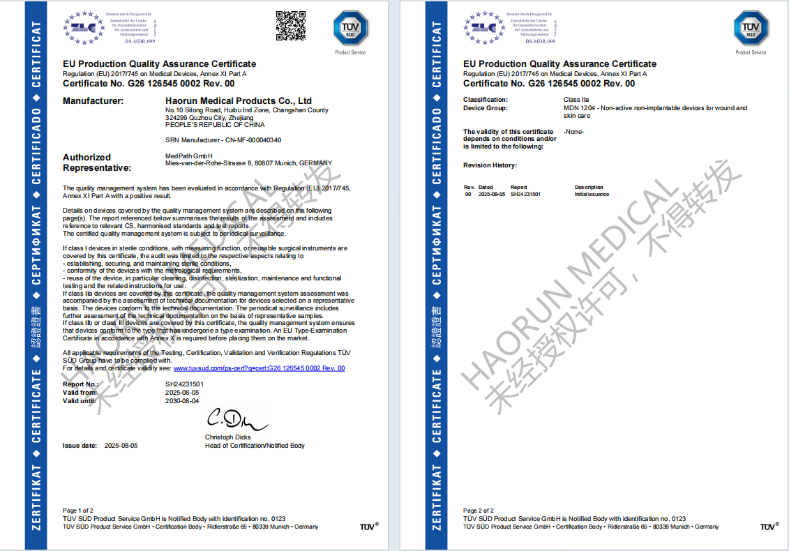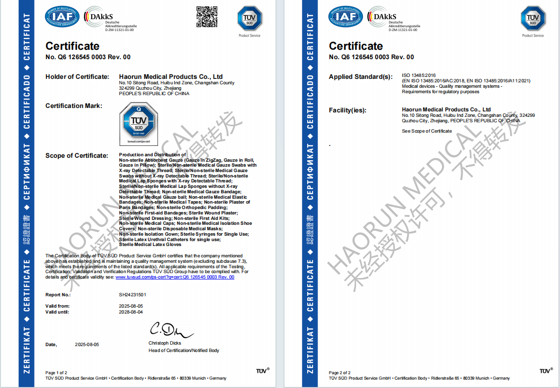 Om de kwaliteit verder te verbeteren, hebben we in september 2023 de publicatie van ons kwaliteitshandboek en onze proceduredocumenten afgerond. Op basis hiervan hebben we in januari 2024 onze kwaliteitsmanagementsysteemdocumenten verbeterd door MDR-gerelateerde inhoud toe te voegen. We zijn op 10 april 2025 geslaagd voor de eerste fase van de TUV SUD-audit, en daarna voor de tweede fase. Eindelijk, in augustus van dit jaar, werd ons certificaatnummer beschikbaar voor weergave in het systeem van de aangemelde instantie, wat een nieuwe stap voorwaarts markeerde in het kwaliteitsmanagementsysteem van Haorun Medical en de basis voor ontwikkeling van het bedrijf versterkte. Onze medische wegwerpartikelen (gaas, gaasrollen, gaasverbanden, enz.) bieden klanten over de hele wereld superieure productkwaliteit en service.
